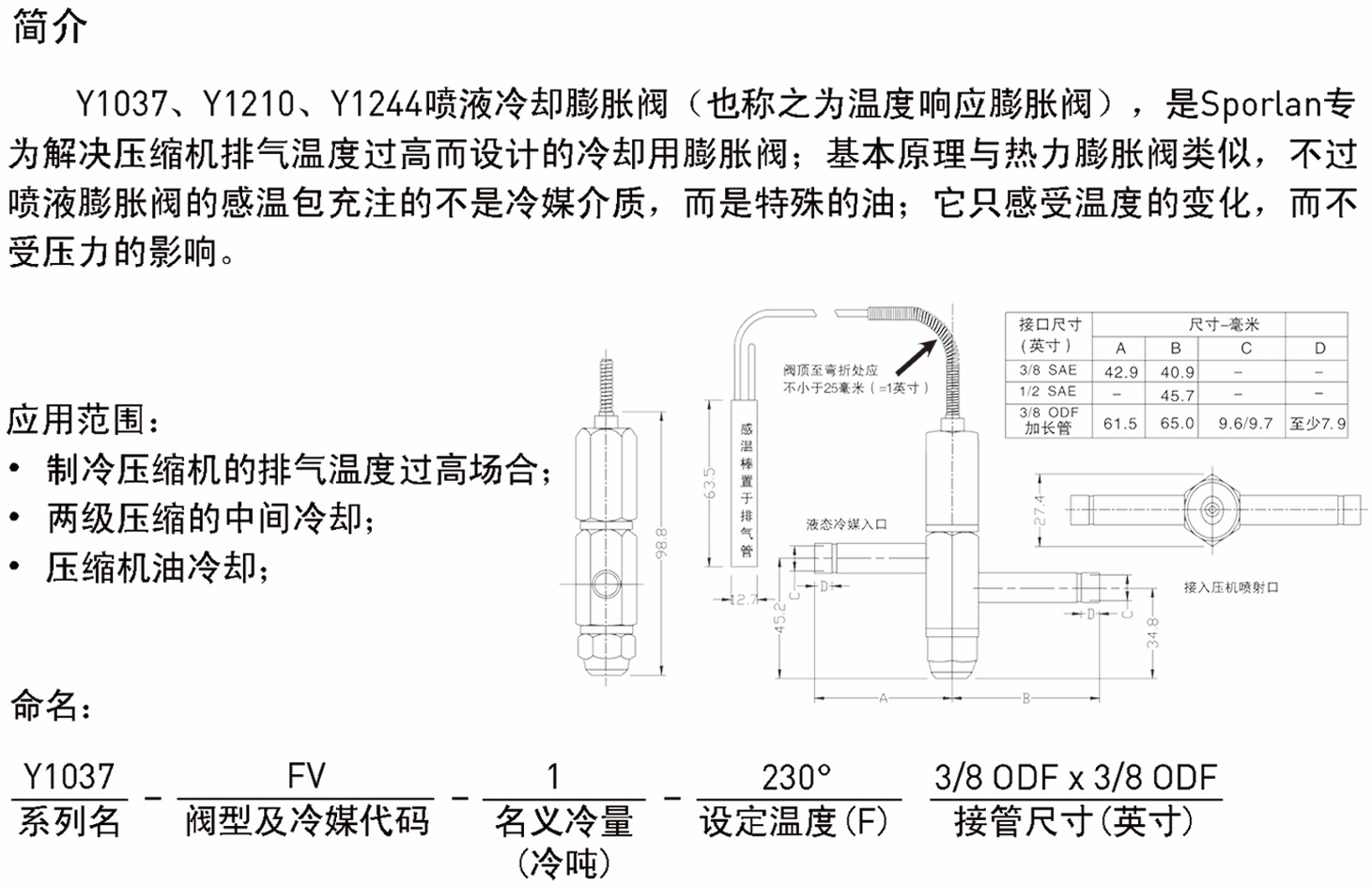 Y1037、Y1210、Y12244喷液冷却膨胀阀(也称之为温度响应膨胀阀),是Sporlan专为解决压缩机排气温度过高而设计的冷却用的膨胀阀,基本原理与热力膨胀阀类似,不过喷液膨胀阀的感问包充注的不是冷媒介质,而是特殊的油,它只感受温度的变化,而不受压力的影响。