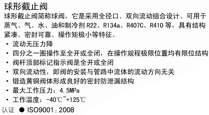 球形截止阀简称球阀,它是采用全经口,双向流动组合设计、可用于蒸汽、气、水、由和制冷剂R22、R134a、R407C、R410等,具有结构紧凑、密封可靠、操作矩极小等特征。
