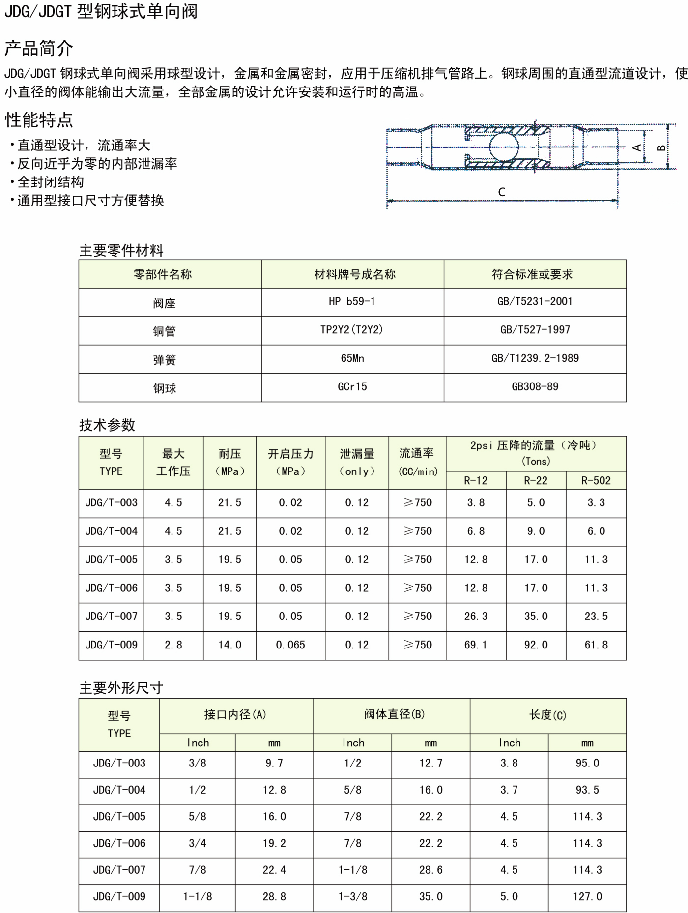 JDG/JDGT刚球式单向阀采用球形设计,金属和金属密封,应用于压缩机排气管路上,钢球周围的直通型流道设计,使小直径的阀体能输出大流量,全部金属的设计允许安装和运行时的高温。