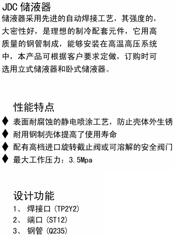 储液器采用先进的自动焊接工艺,其强度的大密性好,是理想的制冷配套元件,它用搞质量的钢管制成,能够安装在高温高压系统中,本产品根据客户要求定制,订购时可选用立式储液器和卧式储液器。