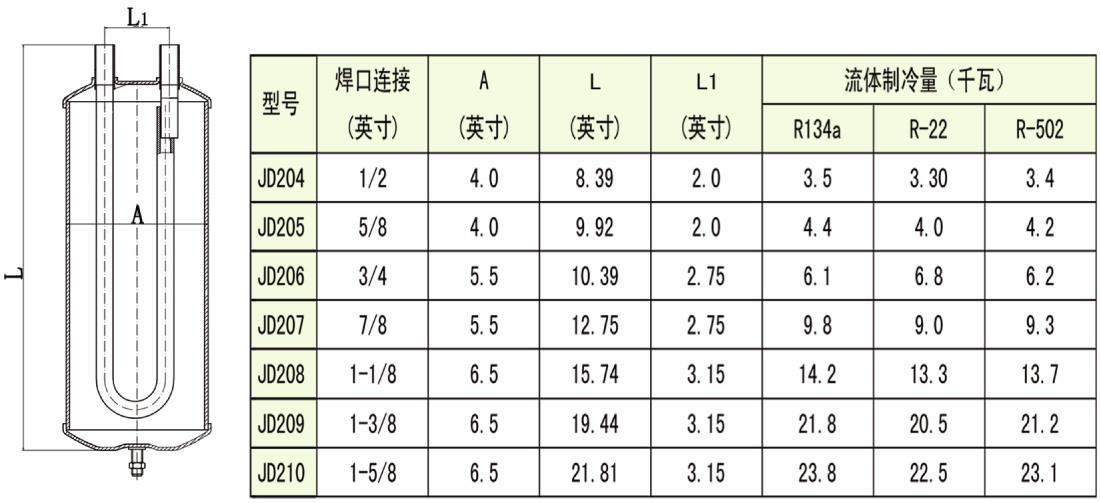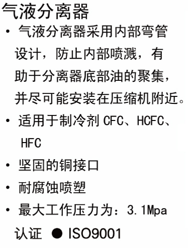 气液分离器采用内部弯管设计,防止内部喷溅,有助于分离器底部油的聚集,并尽可能安装在压缩机附件。适用于制冷剂CFC、HCFC、HFC;坚固的铜接口;耐腐蚀喷塑