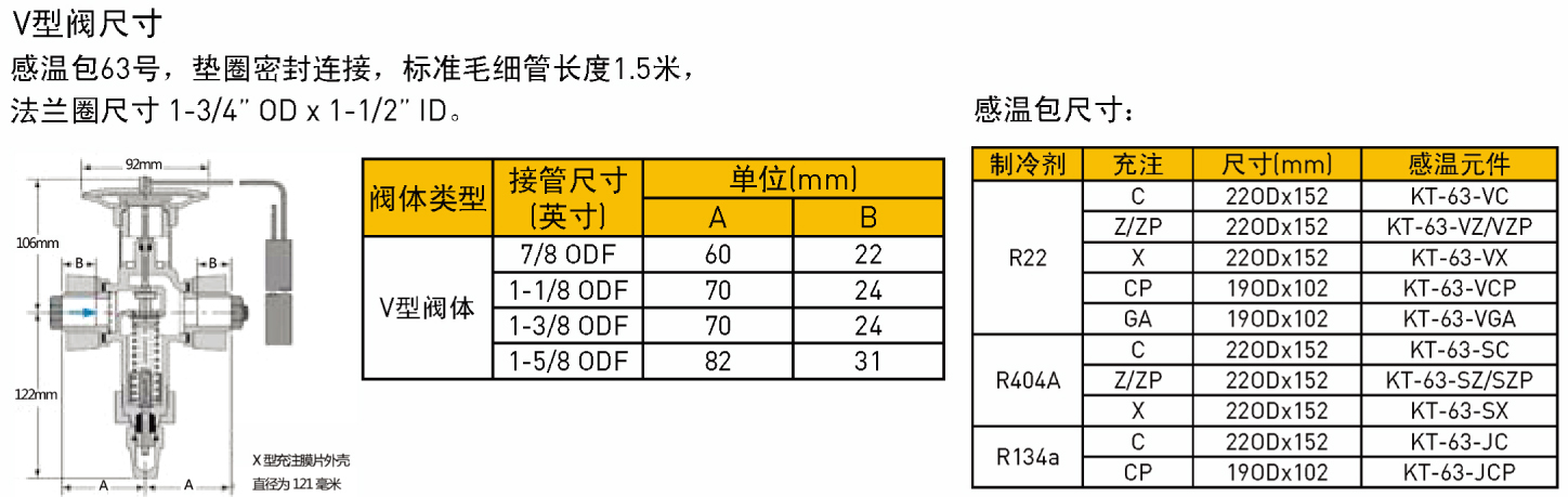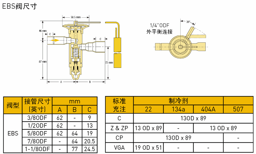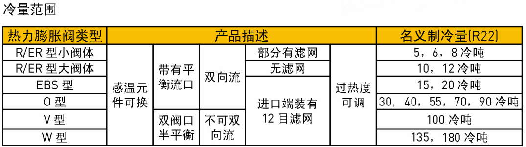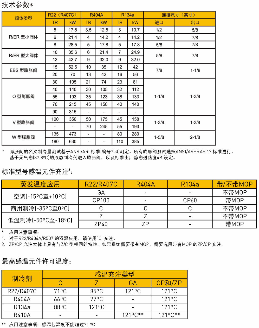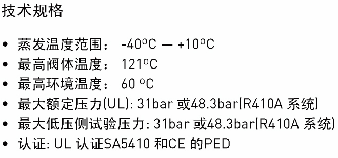 技术规格 蒸发温度范围:-40°C——+10°C 最高阀体温度:121°C 最高环境温度:60°C 最大额定压力(UL):31bar或48.bar(R410A系统)